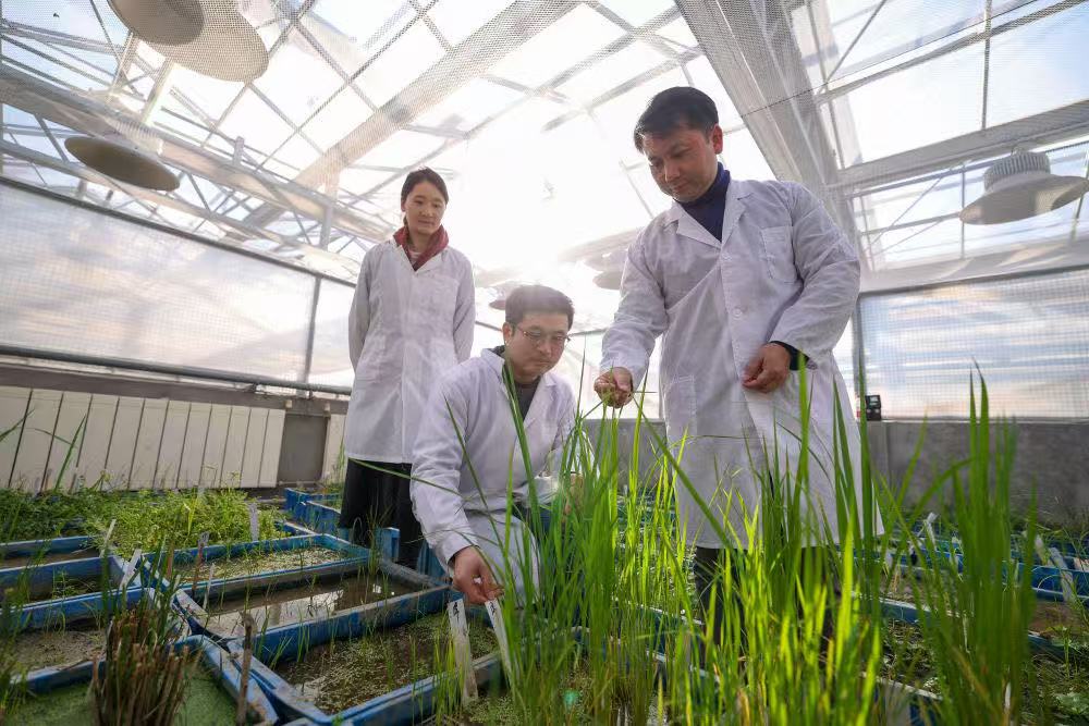 1月15日,中國水稻研究所研究員張?。ㄓ乙唬┰谘芯克鶞厥掖笈飪?nèi)查看水稻樣株的生長情況。新華社記者江漢 攝
