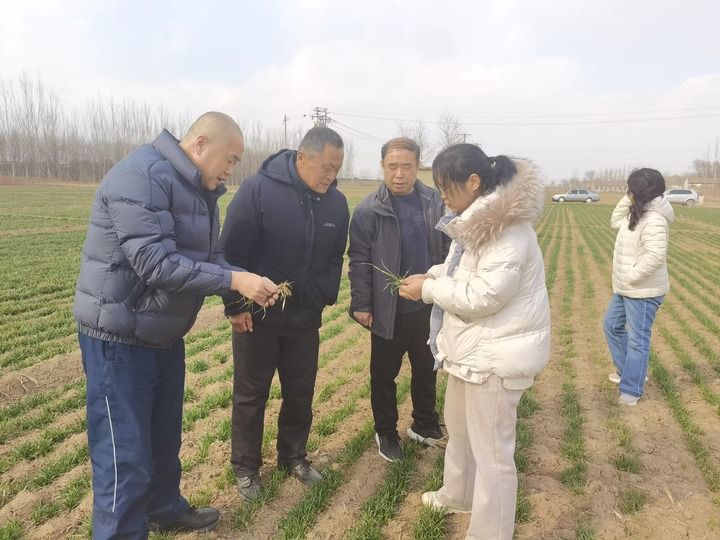 山東省夏津縣農(nóng)業(yè)農(nóng)村局植物保護(hù)站站長、高級(jí)農(nóng)藝師鄭曰英(右二)正在開展小麥苗情調(diào)查、病蟲害監(jiān)測(cè),并指導(dǎo)糧農(nóng)加強(qiáng)春季田管。