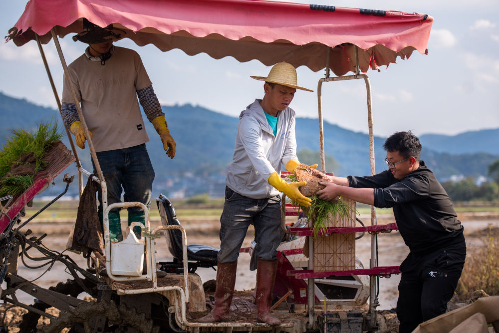多年生稻科技小院的學生(右一)幫助當?shù)剞r(nóng)民一起插秧。