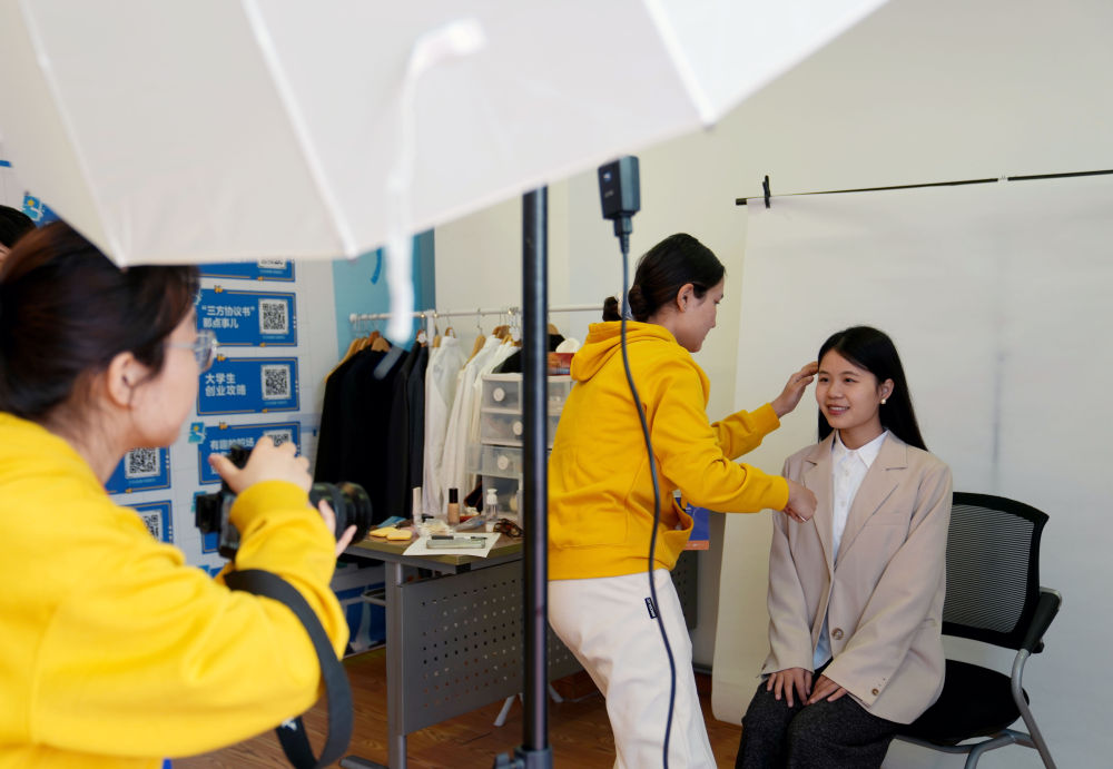 在上海一個大型招聘會現(xiàn)場,工作室團隊為求職者進行簡歷優(yōu)化指導。
