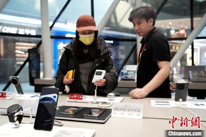 3月5日,消費者在北京一門店選購手機產(chǎn)品。中新社記者 張祥毅 攝
