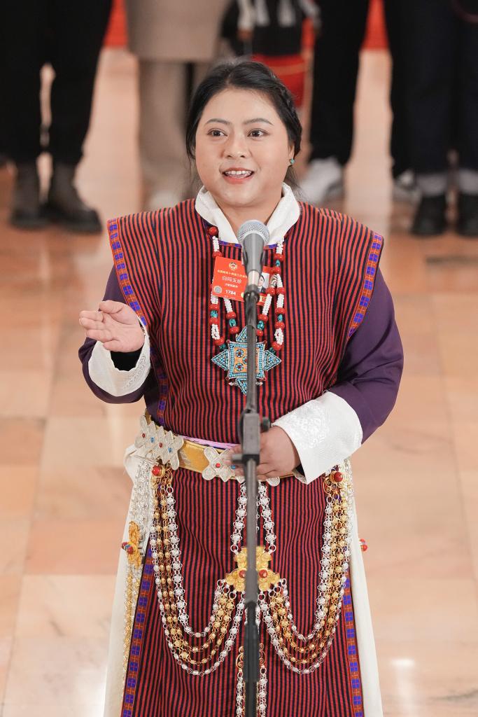 3月10日,全國政協(xié)十四屆三次會議第三場“委員通道”集體采訪活動在北京人民大會堂舉行。這是全國政協(xié)委員白瑪玉珍接受媒體采訪。新華社記者 才揚(yáng) 攝