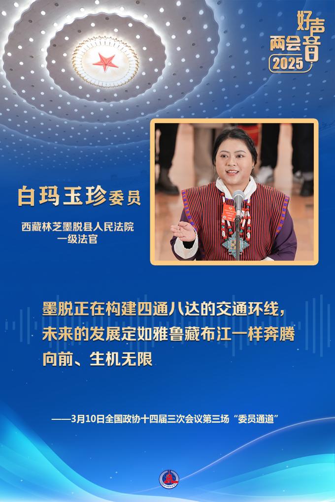白瑪玉珍委員來自全國最后一個(gè)通公路的縣——西藏墨脫。她說,墨脫實(shí)現(xiàn)了從“高原孤島”向“美麗邊城”的時(shí)代蛻變,家家戶戶用上了干凈水、穩(wěn)定電、高速網(wǎng),老百姓吃上了“生態(tài)旅游飯”,增收的路子越來越寬。