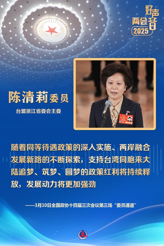 臺盟浙江省委會主委陳清莉委員分享了臺灣同胞在浙江生活、創(chuàng)業(yè)的故事。她表示,隨著同等待遇政策的深入實(shí)施、兩岸融合發(fā)展新路的不斷探索,支持臺灣同胞來大陸追夢、筑夢、圓夢的政策紅利將持續(xù)釋放,發(fā)展動力將更加強(qiáng)勁。