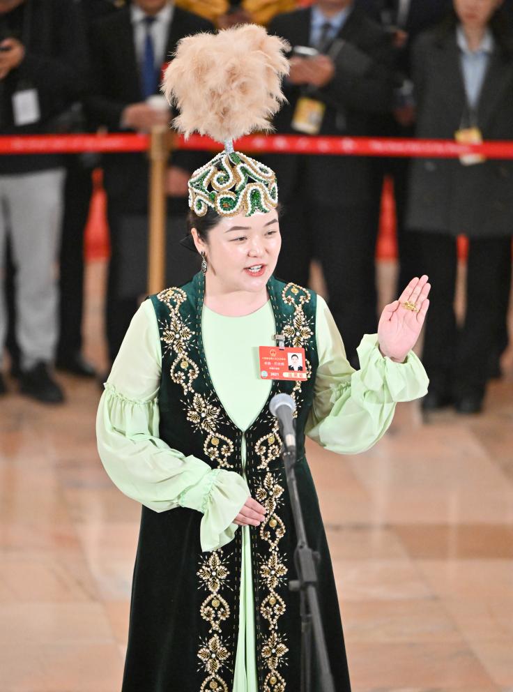 3月11日,第十四屆全國(guó)人民代表大會(huì)第三次會(huì)議第三場(chǎng)“代表通道”集中采訪活動(dòng)在北京人民大會(huì)堂舉行。這是全國(guó)人大代表卓婭·巴合提接受媒體采訪。新華社記者 胥冰潔 攝