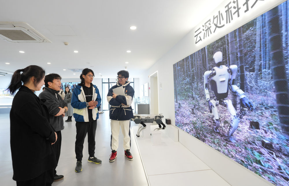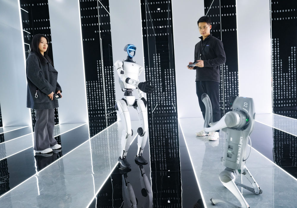 3月1日,在杭州宇樹科技有限公司的產(chǎn)品展示中心,人形機器人和四足機器人在工作人員控制下做動作。新華社記者 翁忻旸 攝