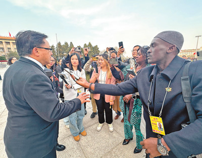 加納通訊社記者斯蒂芬·阿散蒂(右一)在中國全國兩會期間采訪。本報記者 馬 菲攝