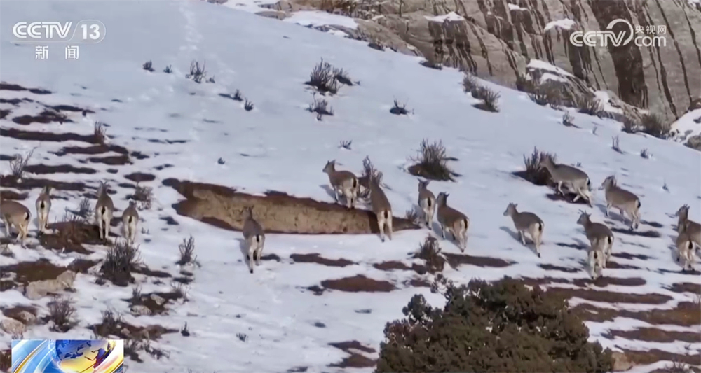 近日,在青海海西州德令哈市附近的柏樹山上,成群巖羊現(xiàn)身雪后高原。畫面中,成群的巖羊正往一處山坡上走,一會(huì)兒肆意奔跑,一會(huì)兒悠閑前行,還在一處山坡上駐足停留了片刻。