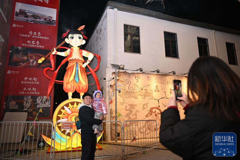 游客在天津哪吒小鎮(zhèn)與哪吒造型的花燈合影(3月16日攝)。