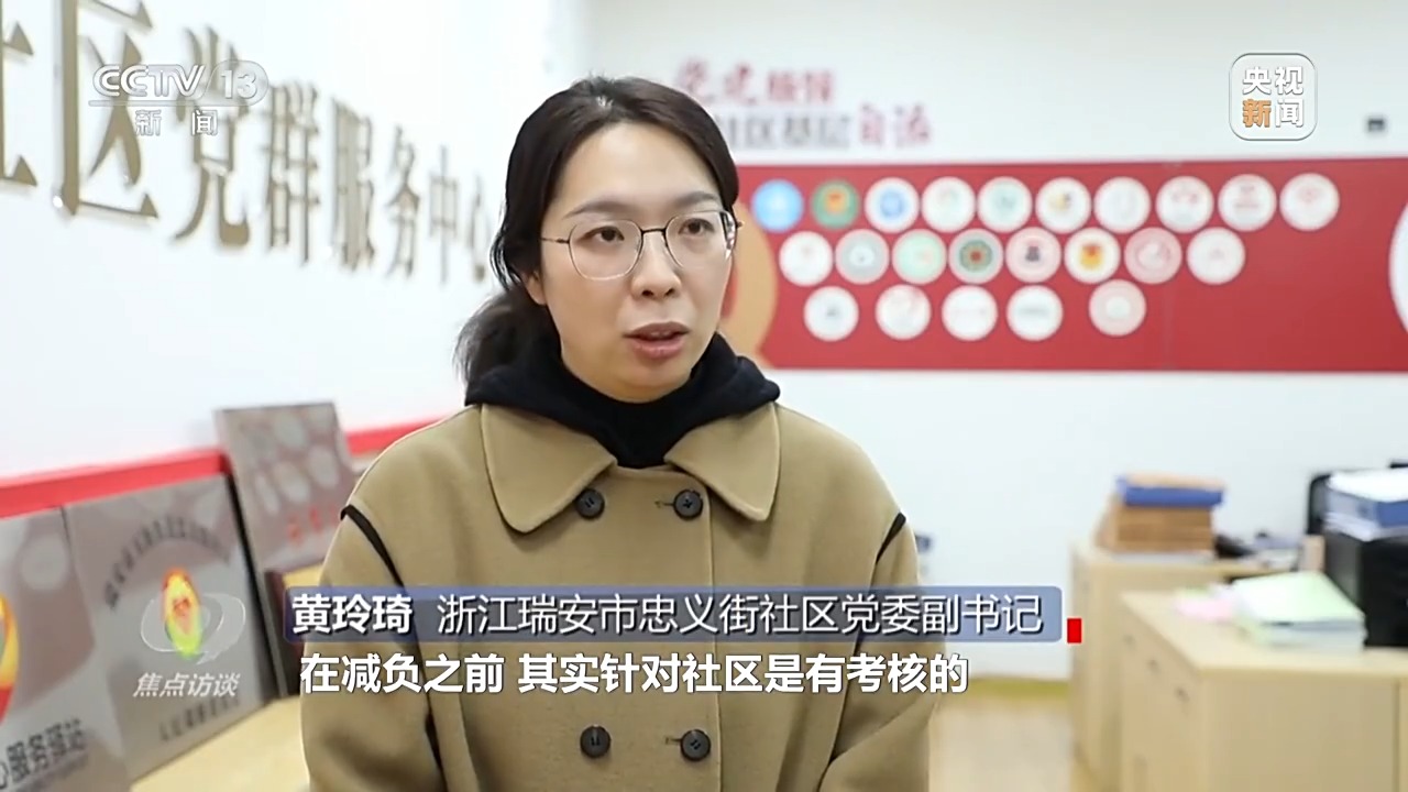 浙江瑞安市忠義街社區(qū)黨委副書記 黃玲琦:在減負之前,其實針對社區(qū)是有考核的,規(guī)定我們每個月要開展八場活動,不可能一整個月都在那里辦活動不開展日常服務,我只能是有一些活動拿過來湊。要想考核好,只能圍繞著考核細則轉(zhuǎn),沒辦法。