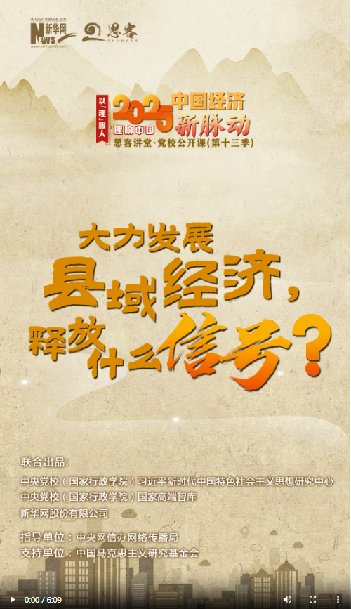 新一季“思客講堂·黨校公開課”《理響中國(guó)·以理服人|2025中國(guó)經(jīng)濟(jì)新脈動(dòng)》,帶你讀懂2025年經(jīng)濟(jì)工作重點(diǎn)。“千億大縣”不斷擴(kuò)容,縣域消費(fèi)“多點(diǎn)開花”,“縣域”二字越來(lái)越火,成為經(jīng)濟(jì)發(fā)展的關(guān)鍵詞。2025年政府工作報(bào)告和2024年中央經(jīng)濟(jì)工作會(huì)議都強(qiáng)調(diào)要大力發(fā)展縣域經(jīng)濟(jì),這釋放了什么信號(hào)?中央黨校(國(guó)家行政學(xué)院)社會(huì)和生態(tài)文明教研部教授王曉莉?qū)Υ诉M(jìn)行解讀。