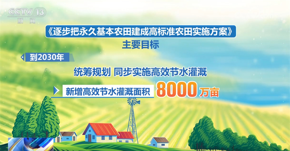 《實施方案》的主要目標(biāo)是:到2030年,力爭累計建成高標(biāo)準(zhǔn)農(nóng)田13.5億畝,累計改造提升2.8億畝,統(tǒng)籌規(guī)劃、同步實施高效節(jié)水灌溉,新增高效節(jié)水灌溉面積8000萬畝;到2035年,力爭將具備條件的永久基本農(nóng)田全部建成高標(biāo)準(zhǔn)農(nóng)田,累計改造提升4.55億畝,新增高效節(jié)水灌溉面積1.3億畝。