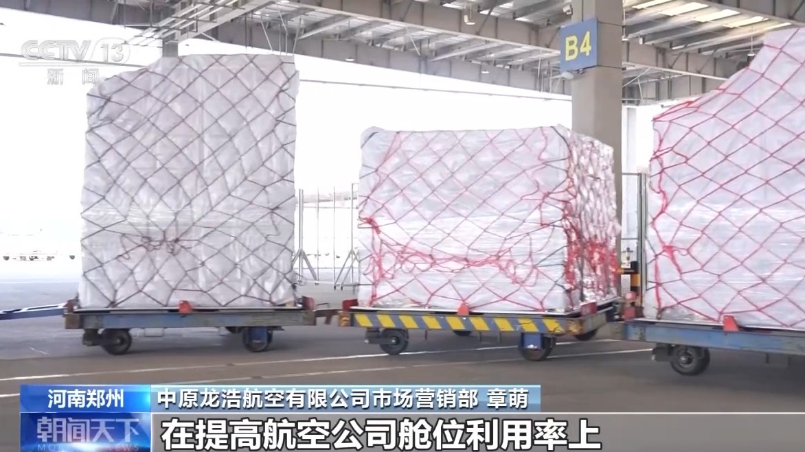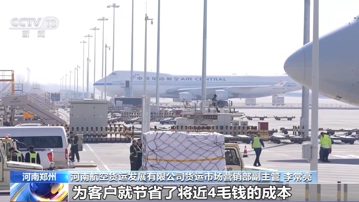 河南航空貨運發(fā)展有限公司貨運市場營銷部 李常亮:時效能夠提升3到6個小時,而且我們現(xiàn)在對中轉(zhuǎn)貨實行一次性收費,算下來相當于我們一公斤為客戶就節(jié)省了將近4毛錢的成本。