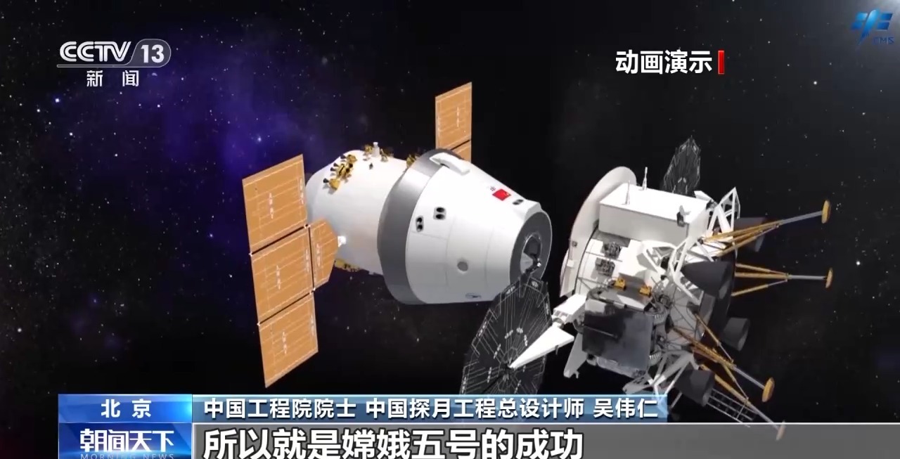 中國工程院院士 中國探月工程總設(shè)計師 吳偉仁:當時就想利用嫦娥五號來驗證我們后續(xù)載人登月技術(shù),載人登月就是在軌道上交會對接,然后人下去探測,探測完后月面起飛,在軌道上交會對接,然后人再進入返回器,返回器再和軌道器脫離,脫離過后,返回器把人送回地球。所以嫦娥五號的成功,為未來我們載人登月奠定基礎(chǔ),幾乎把所有的關(guān)鍵技術(shù)都驗證了一遍。
