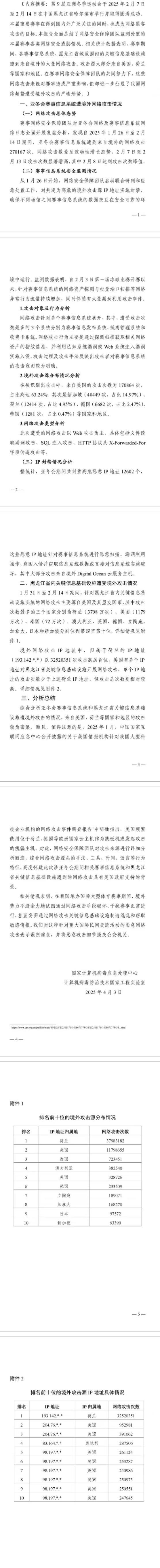 新華社哈爾濱4月3日電(記者王君寶 張建新)3日,國家計(jì)算機(jī)病毒應(yīng)急處理中心計(jì)算機(jī)病毒防治技術(shù)國家工程實(shí)驗(yàn)室發(fā)布“2025年哈爾濱第九屆亞冬會(huì)”賽事信息系統(tǒng)及黑龍江省內(nèi)關(guān)鍵信息基礎(chǔ)設(shè)施遭境外網(wǎng)絡(luò)攻擊情況監(jiān)測(cè)分析報(bào)告,內(nèi)容顯示2025年1月26日至2月14日期間,亞冬會(huì)賽事信息系統(tǒng)遭到來自境外的網(wǎng)絡(luò)攻擊達(dá)270167次。