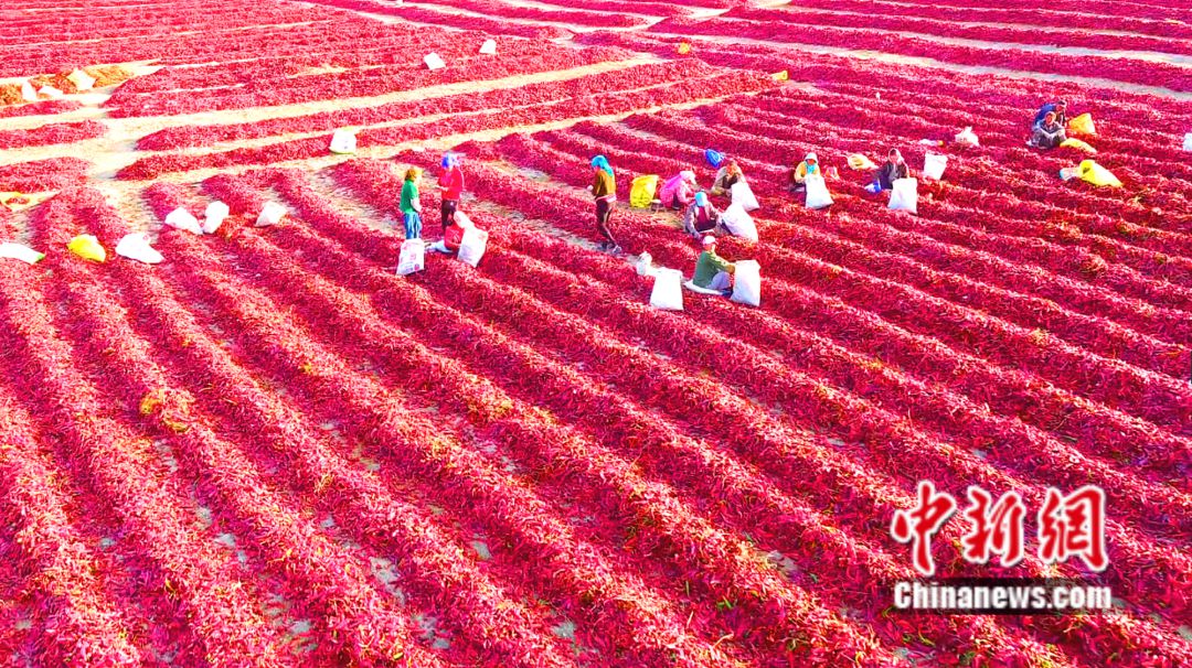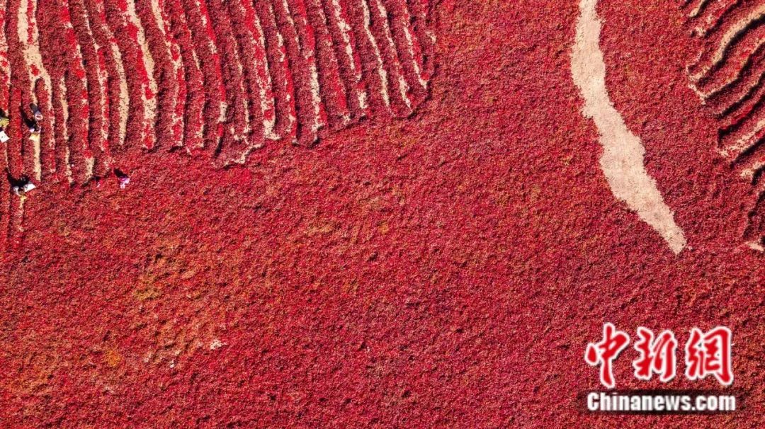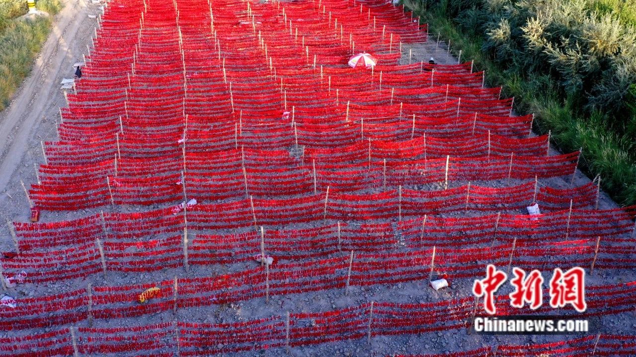 航拍焉耆縣焉耆鎮(zhèn)農(nóng)民晾曬紅辣皮子。楊志榮 攝