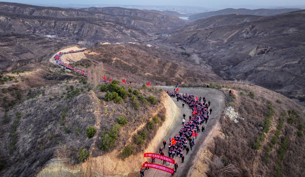 4月3日,參加徒步祭英烈活動(dòng)的師生們翻越黃峁山。