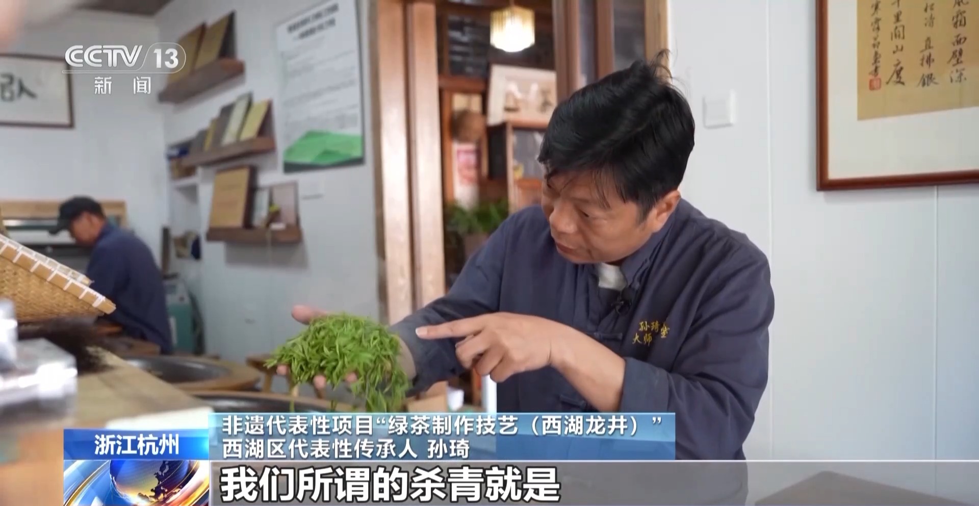 非遺代表性項(xiàng)目“綠茶制作技藝(西湖龍井)”西湖區(qū)代表性傳承人 孫琦:殺青就是讓它快速地走水,西湖龍井是色綠、香郁、味甘、形美。