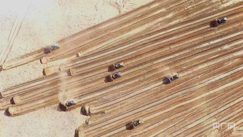 “民豐縣經(jīng)過無數(shù)次試驗,選擇蘆葦鋪設(shè)草方格沙障,帶動了蘆葦收割產(chǎn)業(yè),參與收割的農(nóng)牧民人均增收7740元左右?!辟Z磊說。