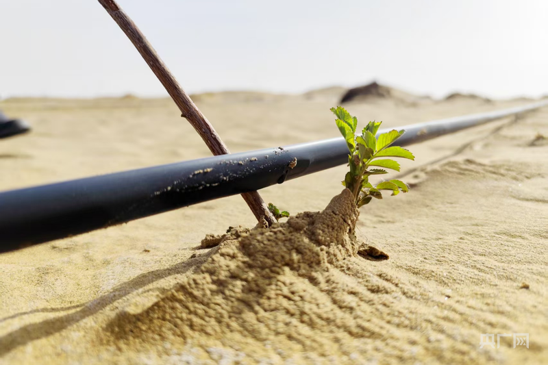 數(shù)臺推土機(jī)以磅礴之勢推平連綿沙丘,為綠色的希望開辟道路;林草技術(shù)中心的技術(shù)人員與護(hù)林員協(xié)作栽種耐旱中草藥苗,每個動作都飽含著對這片沙地的期待;去年完成塔克拉瑪干鎖邊合龍的區(qū)域,沙漠玫瑰沖破沙層露出新芽;滴灌帶的水滴有序落下,滋潤著這片干涸的沙漠,像一條條生命的脈絡(luò)延伸在廣袤沙海……