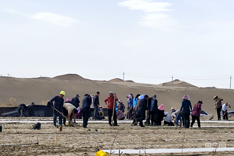 在民豐縣防沙治沙試驗站,林草技術(shù)中心的技術(shù)人員與護(hù)林員協(xié)作栽種耐旱中草藥苗 (央廣網(wǎng)發(fā) 馬曉杉 攝)