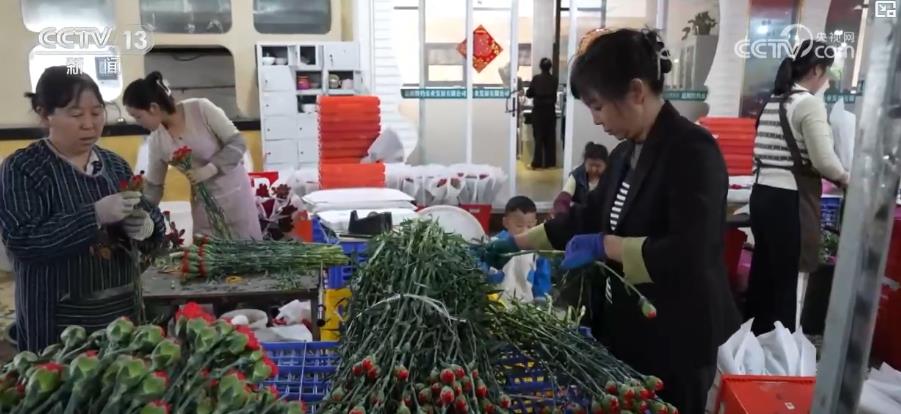 在昆明一家花卉貿(mào)易公司,記者看到,工人們正加班加點(diǎn)對剛剛集中采購回來的康乃馨進(jìn)行二次分級包裝。
