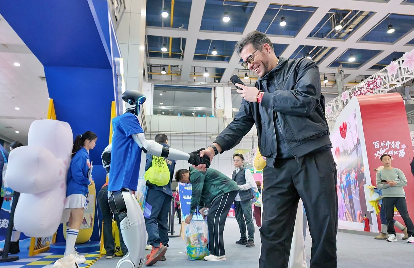 3月20日,在武漢國(guó)際會(huì)展中心,2025武漢馬拉松迎來了首個(gè)參賽選手報(bào)到領(lǐng)物日。委內(nèi)瑞拉選手吳瑞龍看見人形機(jī)器人志愿者,開心地上前與它握手。