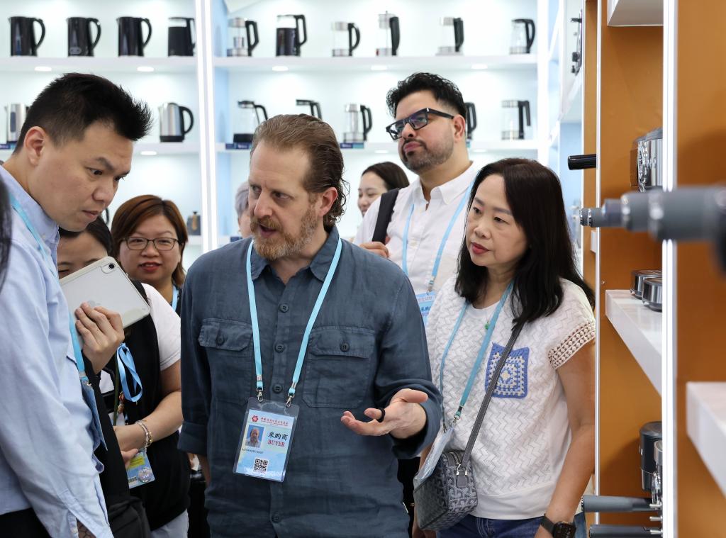 4月15日,一名境外采購(gòu)商(中)在一家電器公司的展區(qū)洽談選購(gòu)。新華社記者 劉大偉 攝