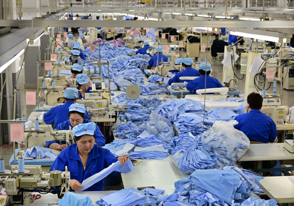 3月25日,山東青島即墨區(qū)即發(fā)工業(yè)園內(nèi)一家服裝企業(yè)的職工在使用智能縫紉機進(jìn)行生產(chǎn)。新華社記者 李紫恒 攝