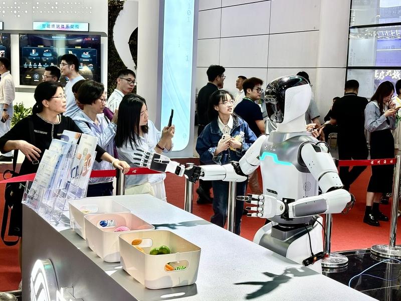 第八屆數(shù)字中國建設(shè)峰會現(xiàn)場,游客駐足圍觀人形機(jī)器人。(鄭雅梅 攝)