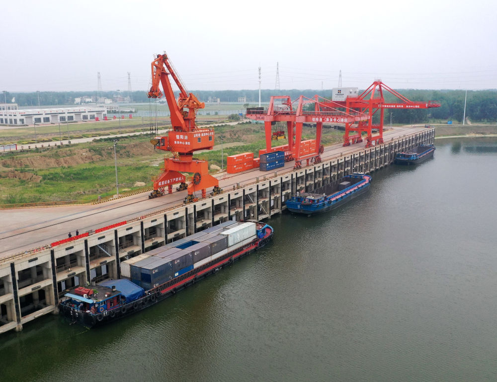 2024年6月5日,貨船停泊在信陽港·淮濱中心港內(無人機照片)。新華社記者 李嘉南 攝