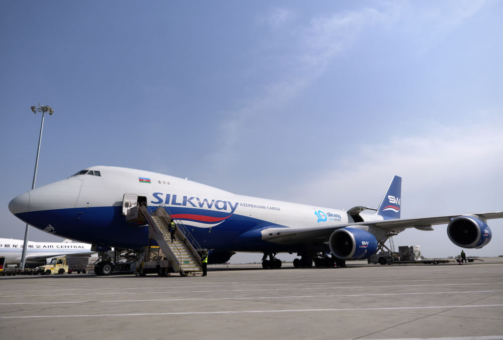 2025年4月2日,一架阿塞拜疆絲綢之路西部航空公司的貨機??吭卩嵵菪锣崌H機場停機坪上。新華社記者 李嘉南 攝
