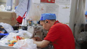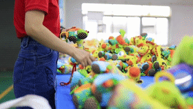 車間另一頭,品檢組組長梁建敏正給玩具成品審核把關。梁建敏很瘦,但很有能量,拖貨、倒貨、檢查貨,好像總有使不完的力氣,臉上總是掛著陽光般的笑容,眼睛里充滿對工作的熱忱。她驗貨時不單用眼睛,還會把毛絨玩具貼近耳朵來聽。