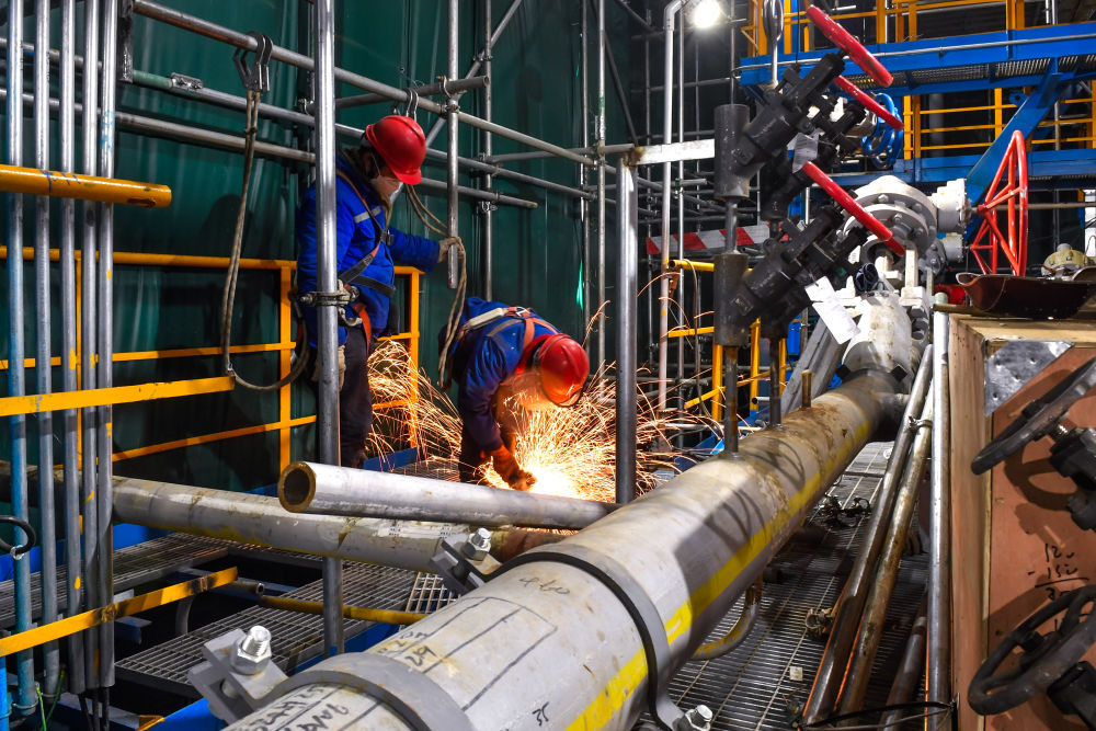 2月12日,工人在位于吉林省吉林市的中國石油吉林石化公司煉油化工轉(zhuǎn)型升級項目120萬噸/年乙烯裝置建設現(xiàn)場施工作業(yè)。新華社記者 許暢 攝