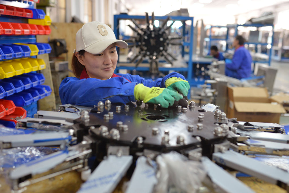 3月30日,在山東省青島市城陽區(qū)夏莊街道青島義龍裝備制造股份有限公司生產(chǎn)車間內(nèi),工人在組裝包裝機。新華社發(fā)(王海濱攝)