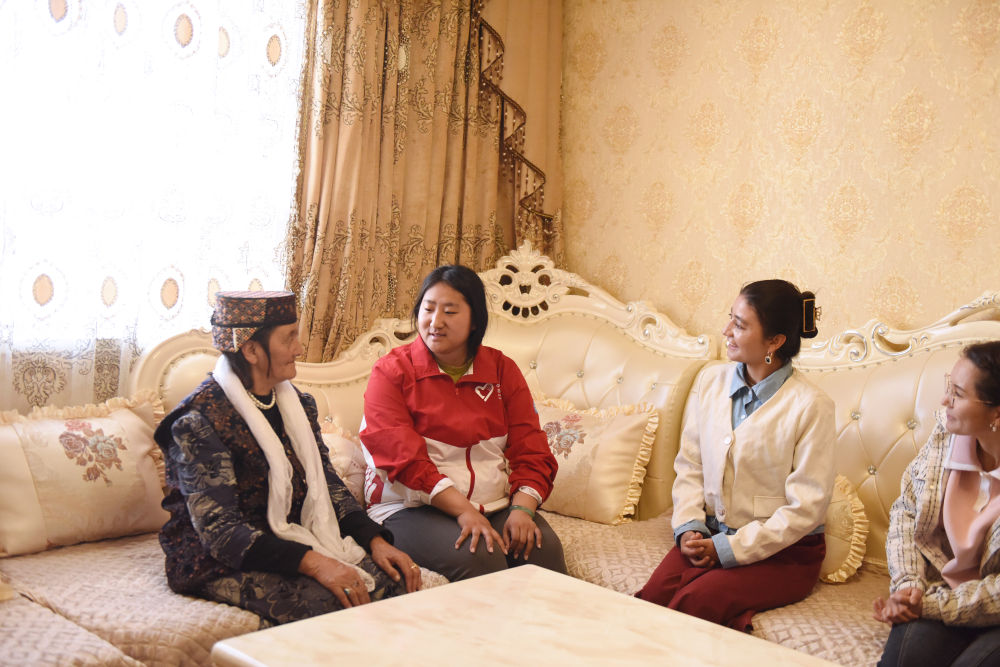 在新疆塔什庫爾干塔吉克自治縣,志愿者黃薈如(左二)在轄區(qū)內入戶走訪(2025年4月14日攝)。新華社記者 高晗 攝