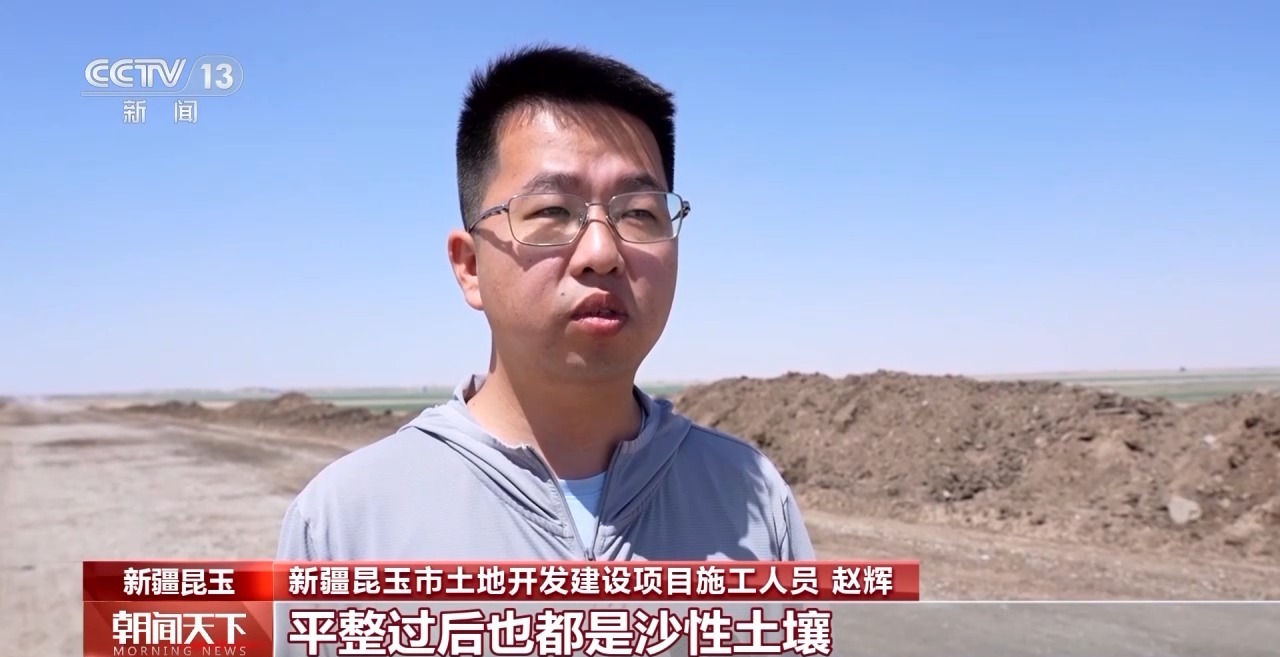 新疆昆玉市土地開發(fā)建設(shè)項(xiàng)目施工員 趙輝:這邊原本都是沙漠原始地貌,平整過(guò)后也都是沙性土壤,沙土的營(yíng)養(yǎng)貧瘠,肥力差,抓一把土,能從指縫里漏掉90%。通過(guò)羊糞和水溶肥的有效結(jié)合,施進(jìn)去之后,我們能把沙土的結(jié)構(gòu)團(tuán)?;?,簡(jiǎn)單來(lái)說(shuō)就是把一團(tuán)散沙變成緊密有孔隙的小團(tuán)體,這樣施進(jìn)去的水和營(yíng)養(yǎng)都能留存住。