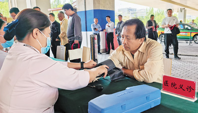 “您這血壓有點(diǎn)高,‘五一’假期活多,別忘了吃藥?!薄坝涀±?,謝謝?!?1歲的司機(jī)楊建民在門口的義診攤位量完血壓,整理著衣袖。