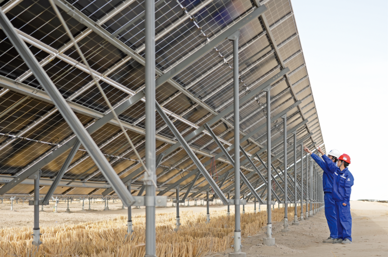 “光伏板不僅可以發(fā)電,還可以降低地表風(fēng)速,起到穩(wěn)定沙土的作用?!敝须娊ǎㄉ逞牛┬履茉窗l(fā)電有限公司項(xiàng)目經(jīng)理杜思偉介紹,草方格不僅能減少沙塵流動(dòng),還能為梭梭苗提供生長保護(hù)??焖偕L的梭梭苗又能以強(qiáng)大的根系,扎根沙土穩(wěn)固沙地。