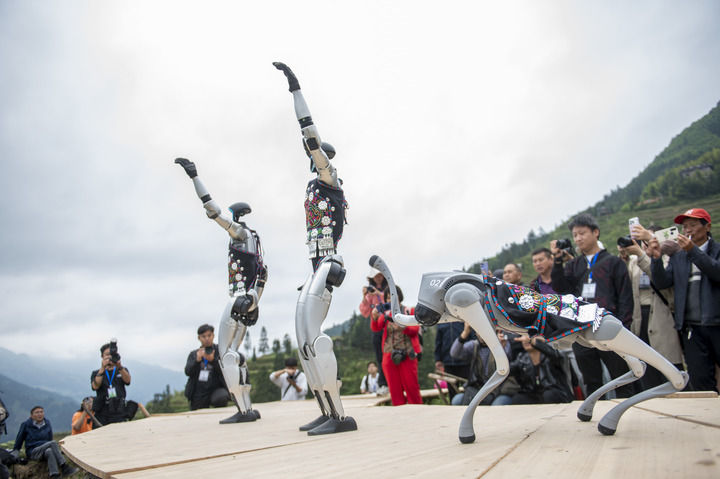 2025年4月26日,機器人在貴州省從江縣加榜梯田上參加梯田走秀活動。