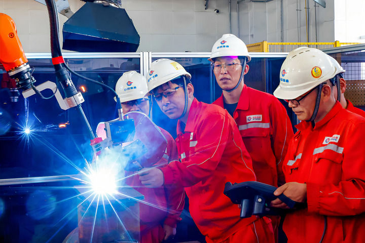 2025年4月29日,在海油工程天津智能化制造基地,劉海林(左二)和同事調試一臺焊接機器人。