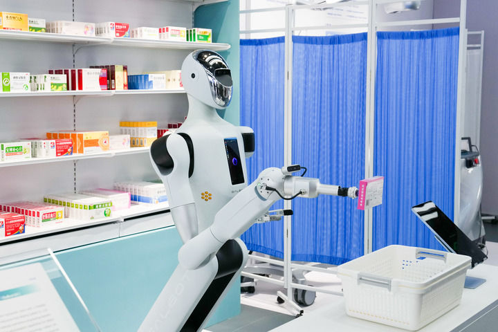 2025年2月24日,在北京“機器人大世界”的應用場景示范區(qū),銀河通用機器人進行藥店無人值守場景演示。