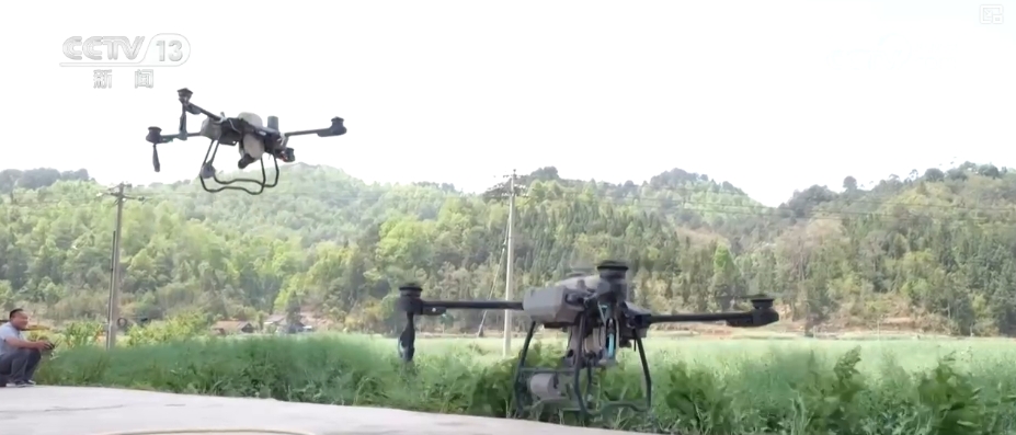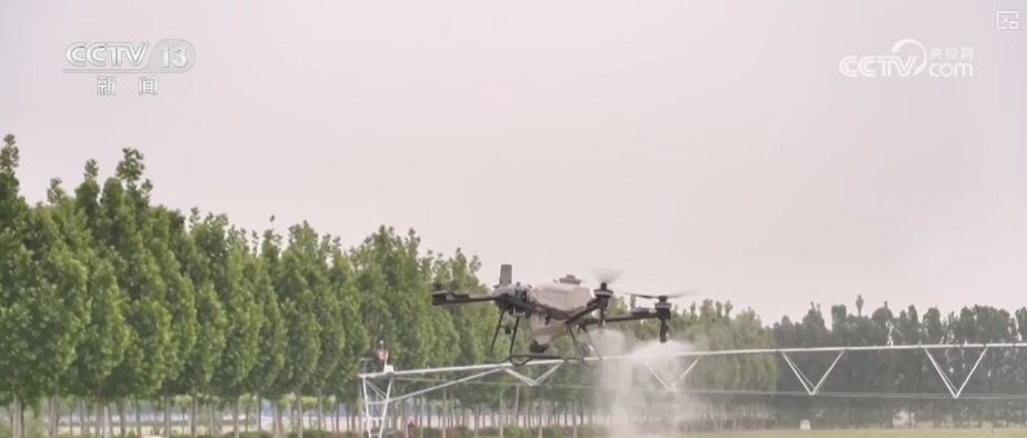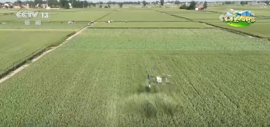 根據(jù)物聯(lián)網(wǎng)蟲情監(jiān)測系統(tǒng)提供的信息,植保無人機在麥田上精準噴灑混合液。