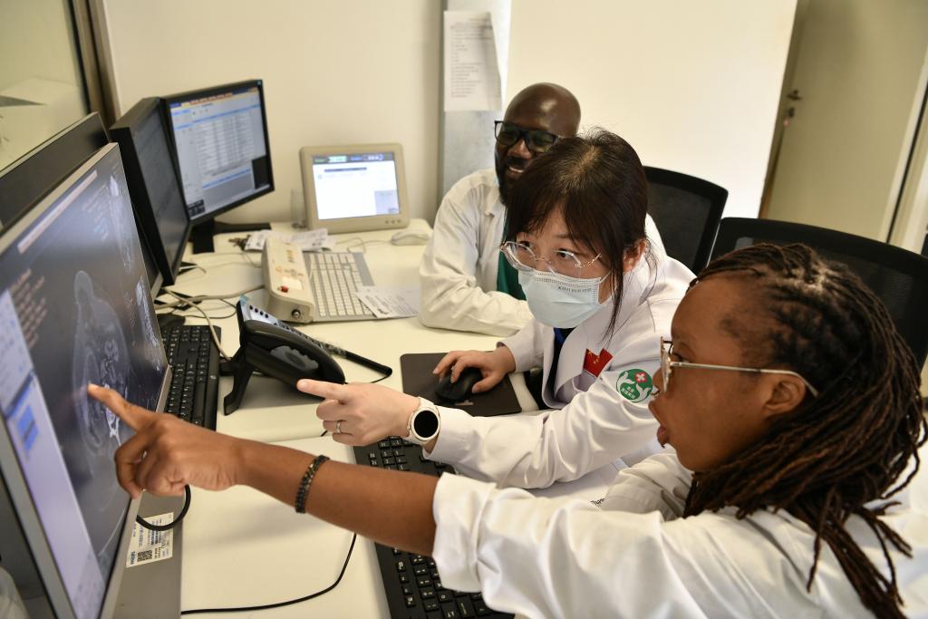 清晨的幾內(nèi)亞首都科納克里,陽光穿透中幾友好醫(yī)院新啟用的醫(yī)療綜合樓玻璃幕墻,灑在走廊上。來自中國的放射科醫(yī)生劉朋與幾方主任阿梅莉·拉馬正俯身在一臺1.5T磁共振儀器前,仔細(xì)分析一名患者的脊柱影像。兩人時而比劃手勢,時而切換中法雙語交流,最終在診斷報告上簽下共同意見。