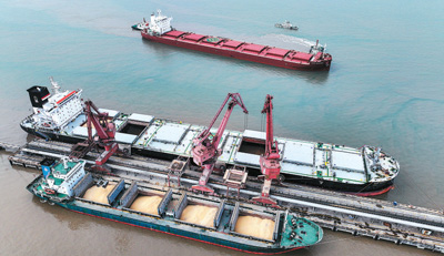 圖為4月24日,一艘滿載巴西大豆的散貨船駛入寧波舟山港老塘山作業(yè)區(qū),靠泊該港區(qū)三期1號泊位。姚峰攝(人民視覺)