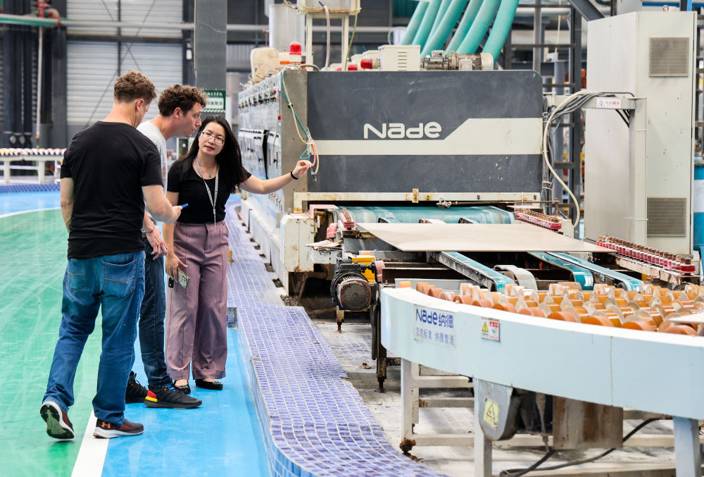 2025年4月22日,兩名參加廣交會(huì)的阿根廷采購(gòu)商專(zhuān)程來(lái)到佛山參觀蒙娜麗莎大尺寸陶瓷巖板自動(dòng)生產(chǎn)線。新華社記者 劉大偉 攝