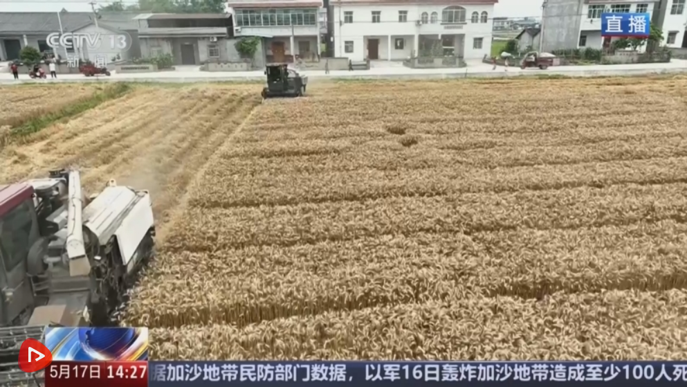 重慶潼南區(qū)八角村的小麥種植基地連片種植的小麥有600多畝,現(xiàn)在小麥從麥稈到麥穗都已經(jīng)變成金黃色,麥粒兒也十分硬實,小麥已完全成熟。這兩天天氣很好,三臺收割機正在同步收割,預(yù)計5小時左右就能完成這一片200多畝小麥的收獲。與人工收割相比,效率提升了50倍左右,這些收獲了的小麥馬上就會被送到烘干廠進行烘干,然后被打磨成面粉,制作重慶人最愛的重慶小面。