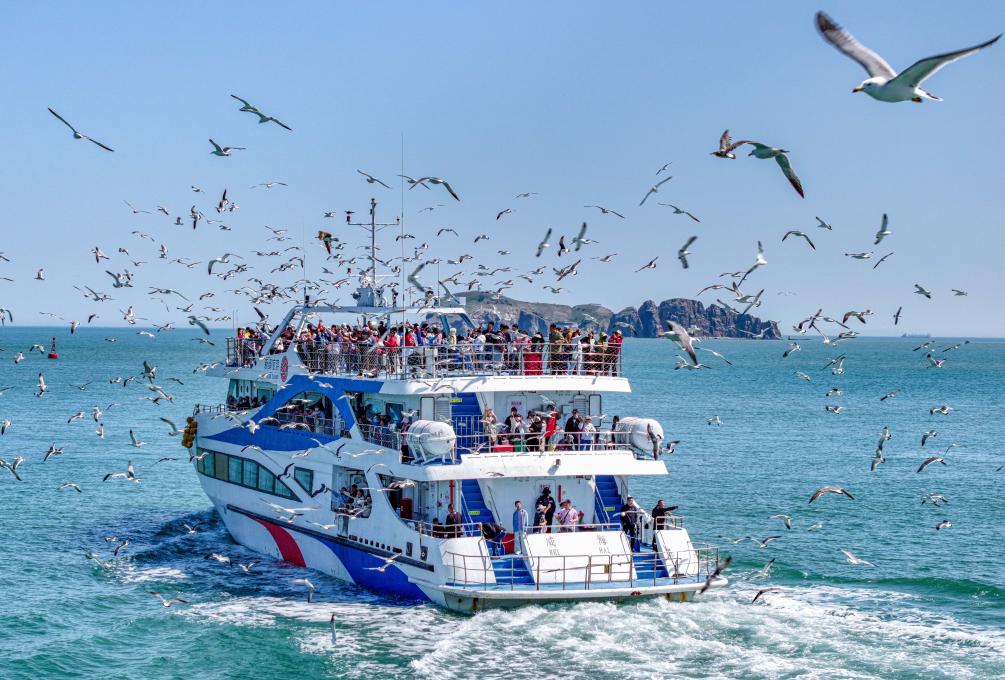 5月4日,在山東省榮成市海驢島海域,游客乘坐海驢島環(huán)島游專線與黑尾鷗互動(dòng)(無(wú)人機(jī)照片)。新華社發(fā)(李信君 攝)