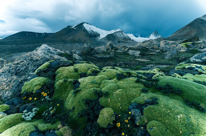 第二天一早,我們繼續(xù)向山脈的腹地去探索,前往冷布崗日腹地的道路也是無(wú)人踏足的,沒(méi)有正規(guī)車道的,所以我們同樣只能沿著牧民留下的車轍印前行。在一望無(wú)際的高原上,我們找不到路的時(shí)候就操縱無(wú)人機(jī)升空去探索路線。經(jīng)過(guò)了一整天的艱難探索,終于抵達(dá)了目的地,這個(gè)地方再往上走是完全沒(méi)有路了。在海拔約5800米左右的這個(gè)地方,不僅有巍峨壯美的雪山,還長(zhǎng)著很多這種獨(dú)特的高山苔蘚,這種植被通常只分布在海拔4000米以上的地區(qū),極具地域特色。所以在拍攝時(shí),我將這些高原特有的植被作為前景,既展現(xiàn)了高原生態(tài)風(fēng)貌,也作為海拔高度的天然標(biāo)識(shí),然后遠(yuǎn)處雄偉的冷布崗日雪山則構(gòu)成了畫面的核心部分。