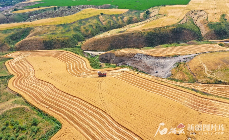 2024年6月24日,在新源縣則克臺鎮(zhèn)則克臺村的麥田里,隨著大型收割機駛過,麥穗、秸稈有序分離,一顆顆麥粒從收割機出料口傾瀉而下,裝進運糧車里。張文庭攝
